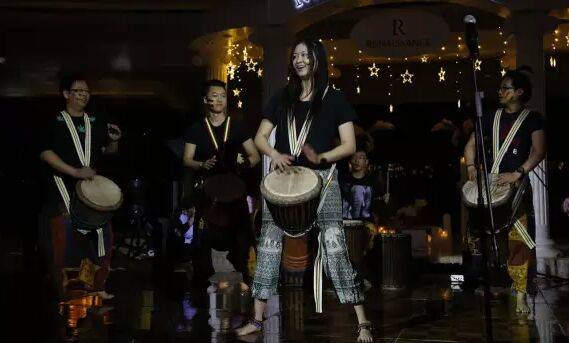 在活动的尾声,一种以最朴实、具有民族色彩的音乐表现形式——非洲鼓,给现场呈现出不插电的艺术魅力,现场观众伴随鼓点,共同享受在一小时熄灯时间里的快乐时光。