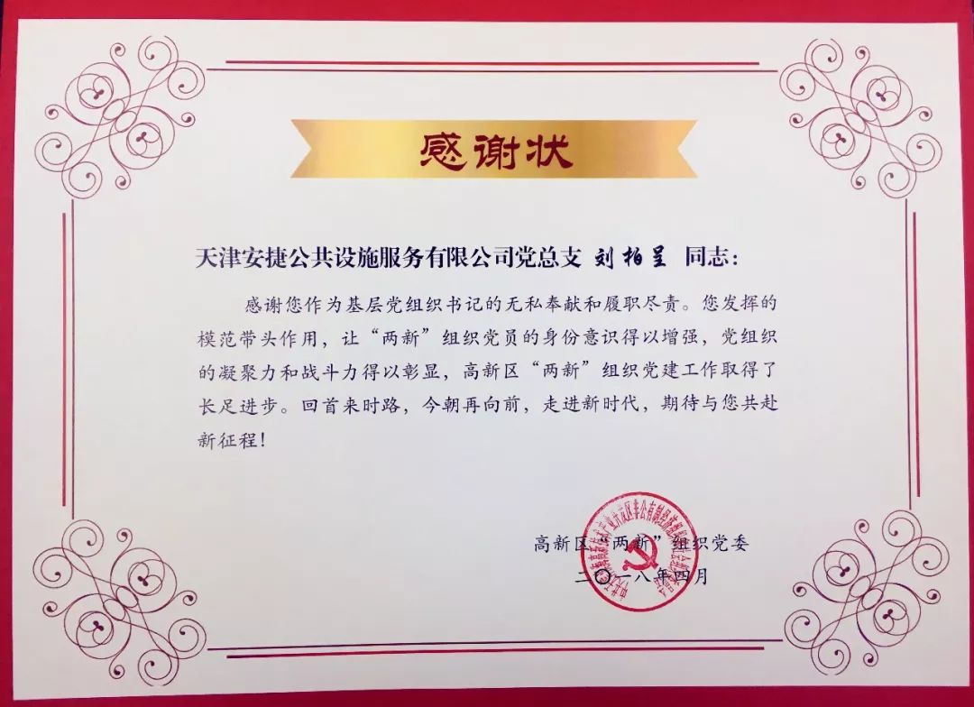 经过高新技术企业党委2017年度工作考核,天津ballbet贝博·(中国)公共设施服务有限公司获得“优秀”的党组织荣誉称号,同时,ballbet贝博·(中国)董事长刘柏呈同志获得“优秀”的党组织负责人荣誉称号。